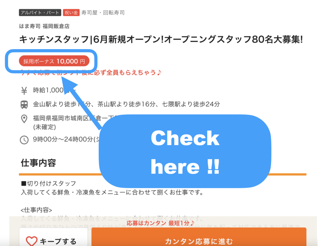 そのアルバイトで働き始めたら採用ボーナスがもらえます。